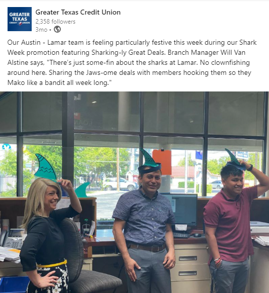 I had the opportunity to develop and launch an entire campaign in the summer of 2022. In my work on the credit union’s SEO, I had optimized our boat loans page, leading to our credit union becoming consistently ranked in the top 3 search results for boat loans in Texas. To test whether or not this was a fruitful search term for us, we utilized Discovery’s Shark Week to promote our boat loans. The campaign ran for two weeks and generated 9 new boat loans for the credit union, in addition to new checking accounts and a record-breaking month for referrals to the credit union from current members.